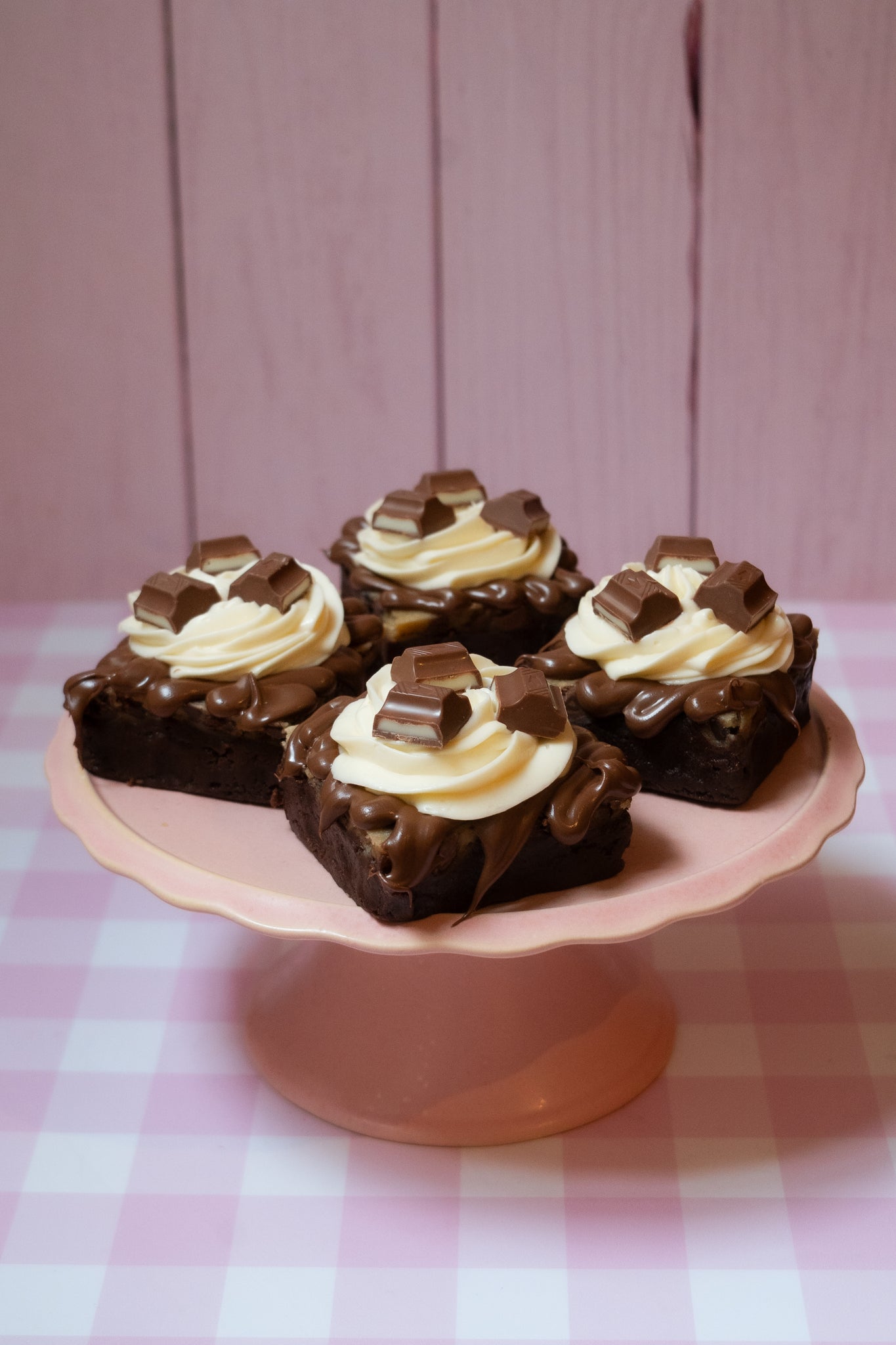 4 brownies cremosos "Amor eterno" ahora con galleta de chispas horneada", cobertura doble de Nutella , cariño (betún de quesito crema endulzado) y chocolate Kinder. ¡Todo un poema!