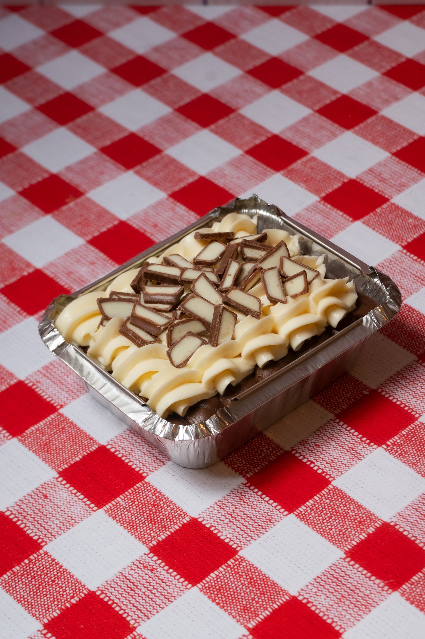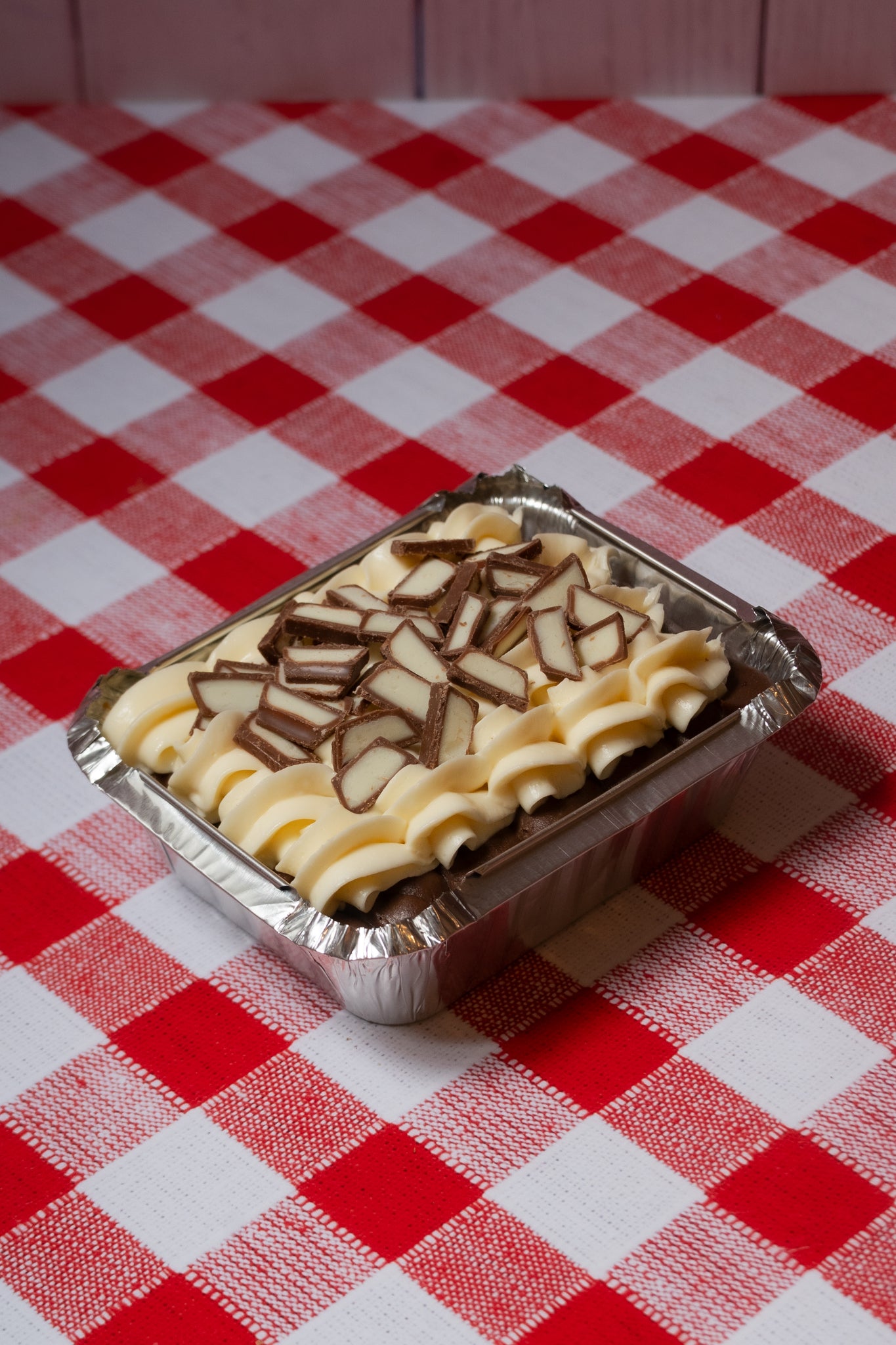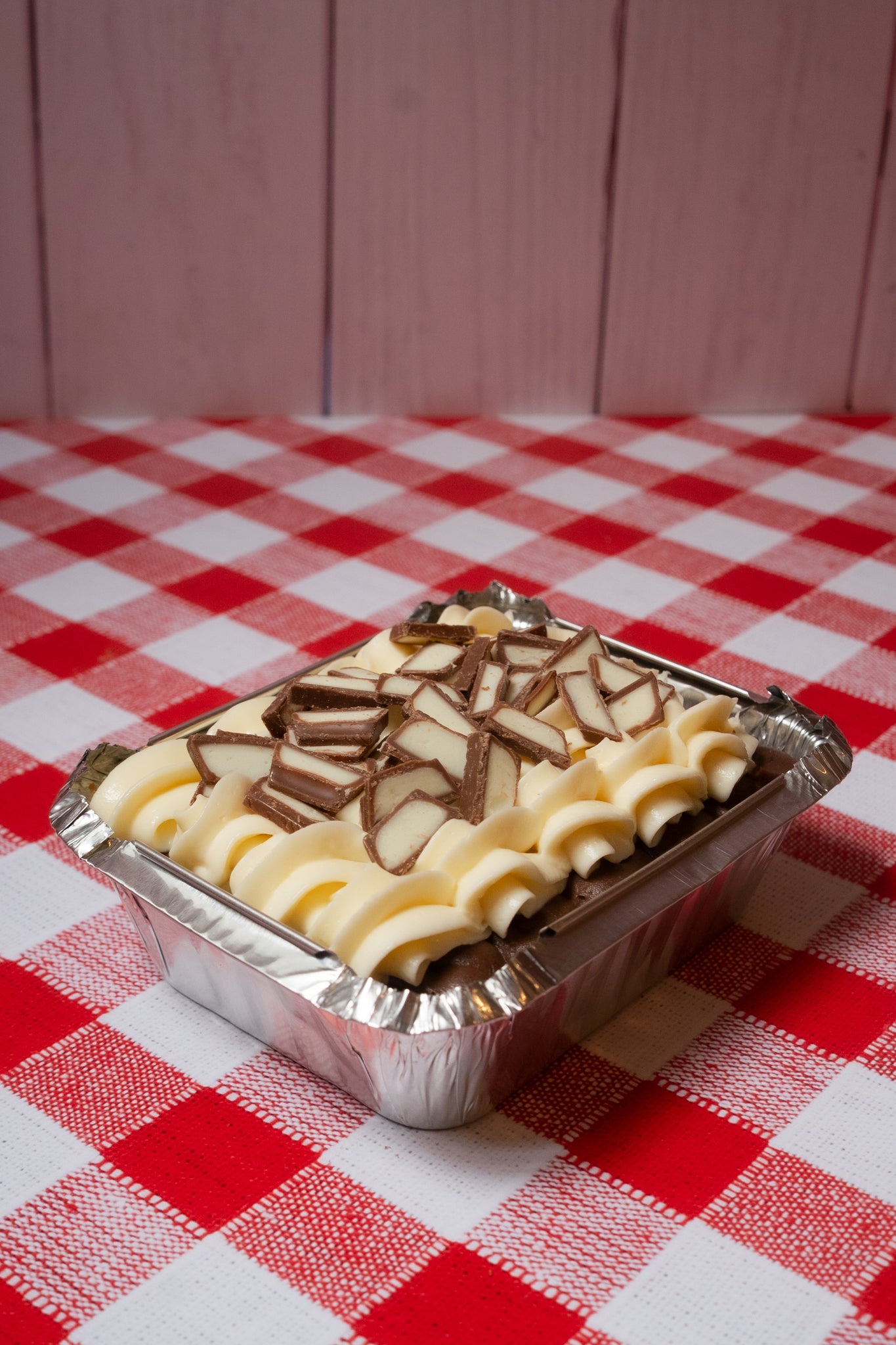 Pan de vainilla con tres leches, relleno de fudge, betún de quesito crema endulzado y Kinder. (rinde hasta 2 porciones)