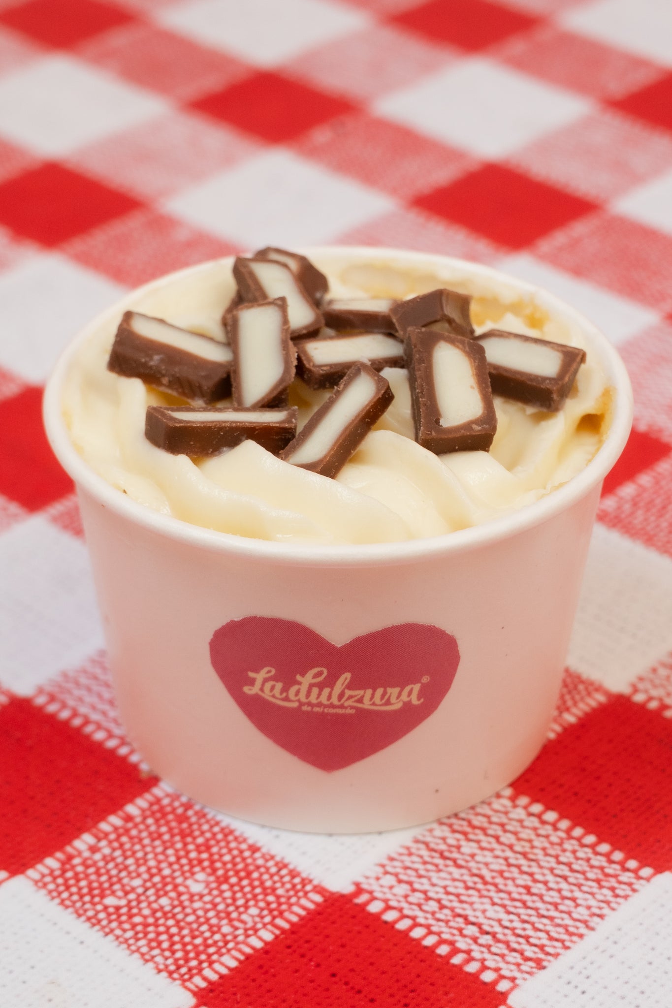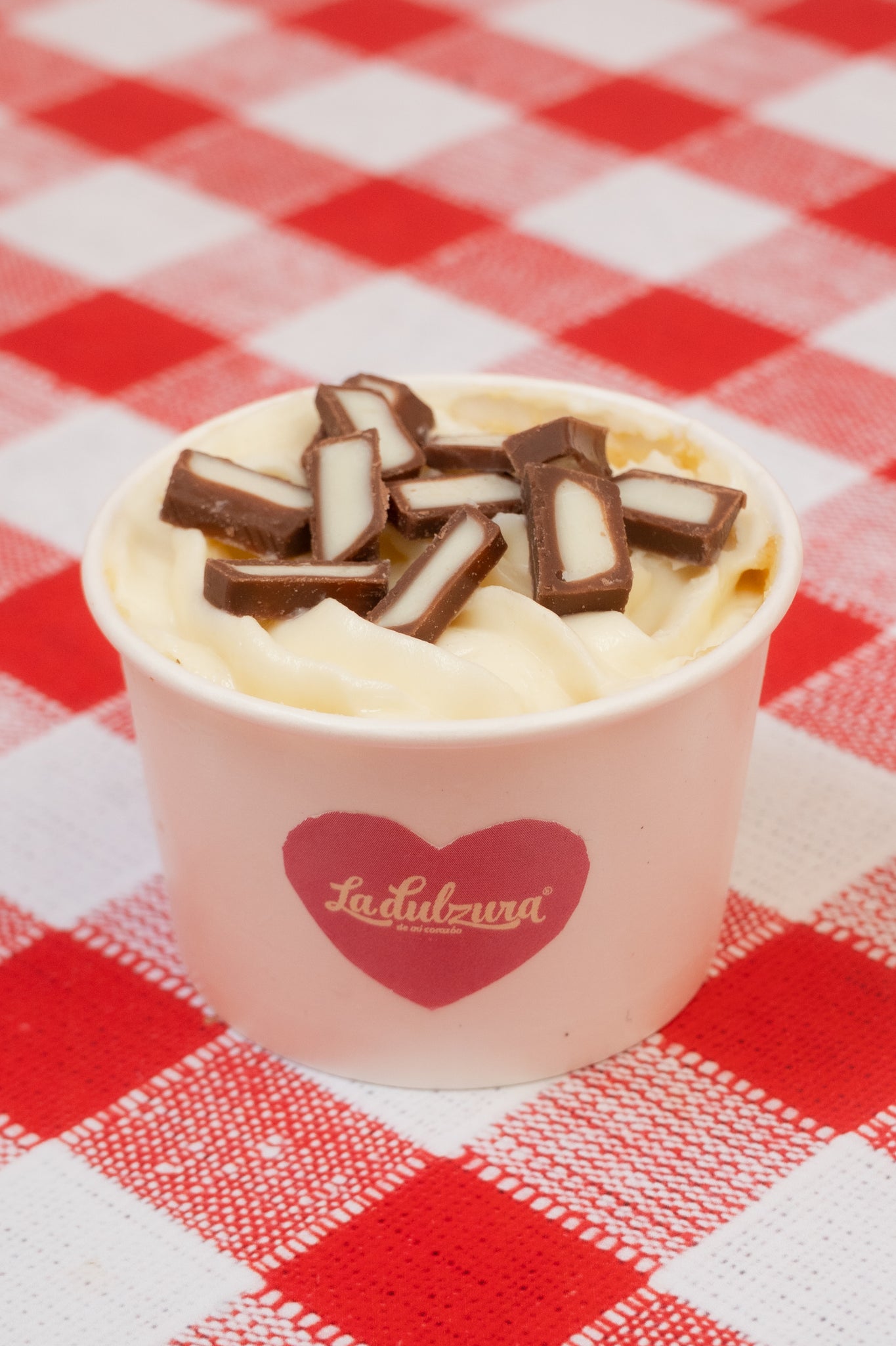 Pan de vainilla con tres leches, relleno de fudge, betún de quesito crema endulzado y Kinder.💕